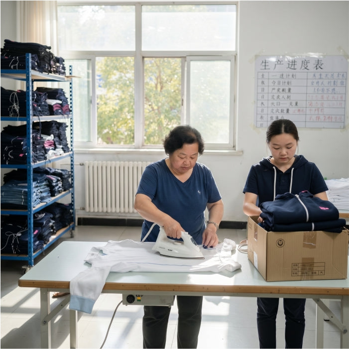 Care labels, size tags, and logos are applied to maintain branding consistency and compliance with industry standards. - Packing and Labeling